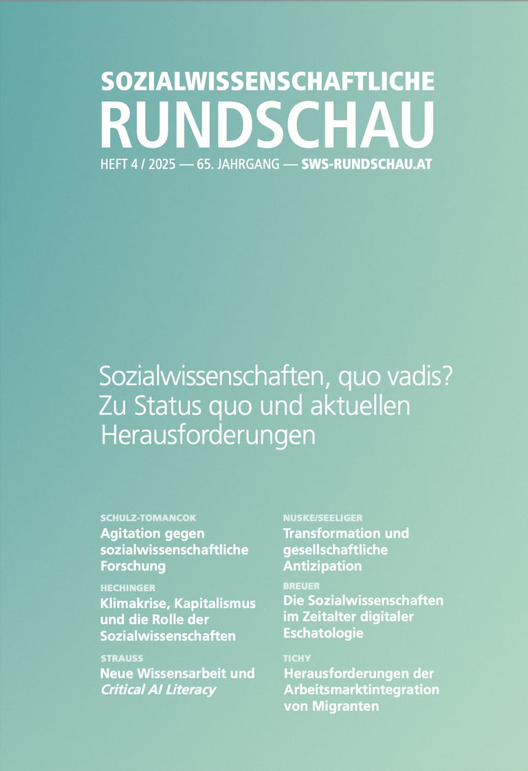 Die Zeitschrift wurde erstmals 1961 von der Sozialwissenschaftlichen Studiengesellschaft (SWS) herausgegeben und trug von 1987 bis 2018 den Namen "SWS-Rundschau". Unser Archiv umfasst alle Jahrgänge von 2001 bis 2018 sowie Bestellmöglichkeiten für einzelne Hefte (Print & Digital). Für Informationen zu früheren Jahrgängen schicken Sie uns direkt eine E-Mail.